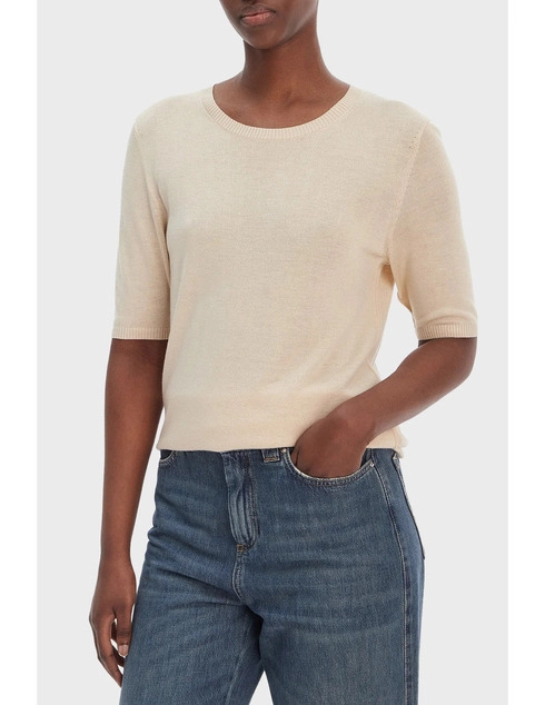 Бежевый легкий свитер Женский свитер Hugo Boss. Модель бежевого цвета. Прямой крой. Круглый вырез горловины. Рукав 3/4. Эластичная ткань. Состав: 60% Viscose 35% Acrylic (24% recycled) 5% Cashmere Сезон: Весна - лето 2026